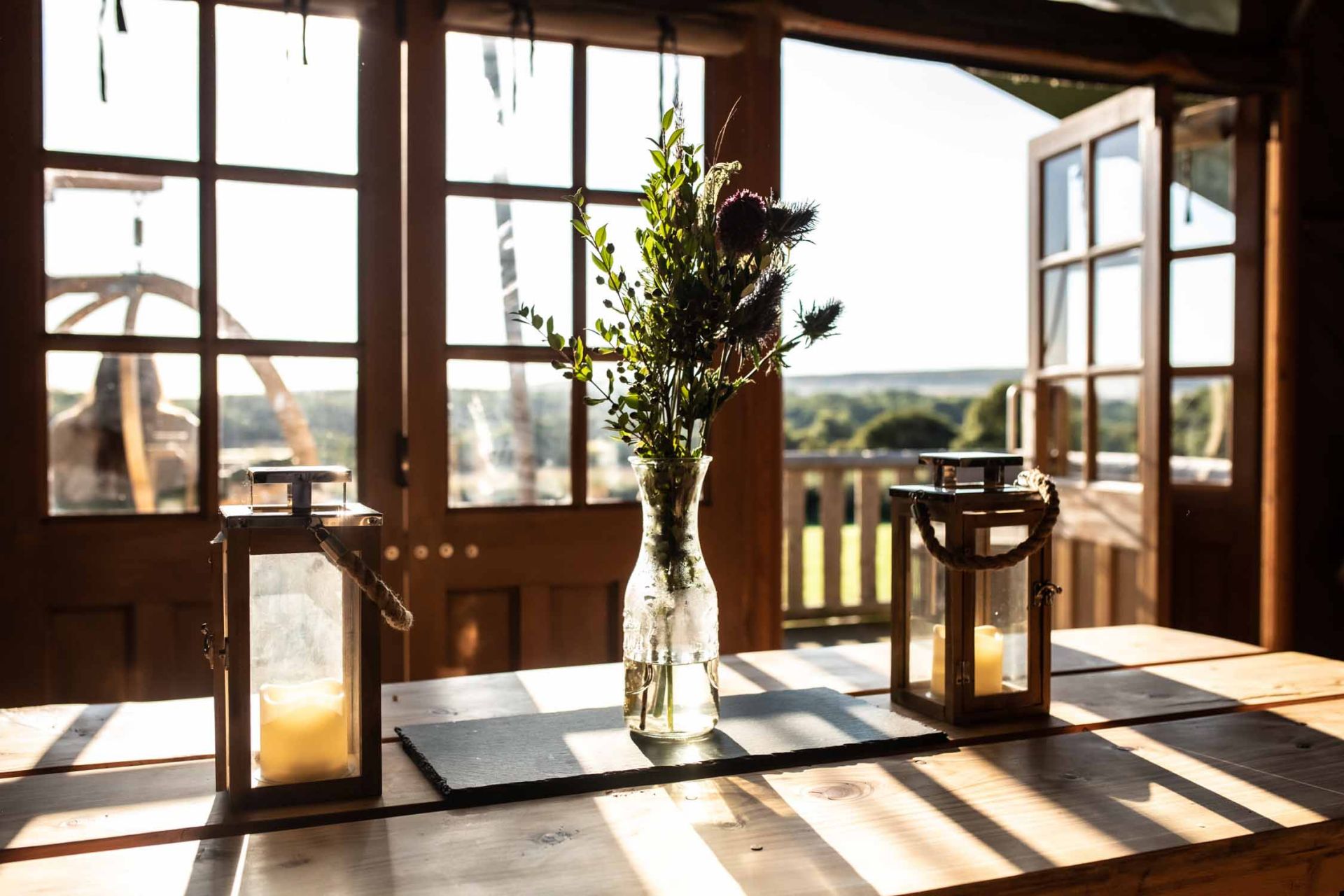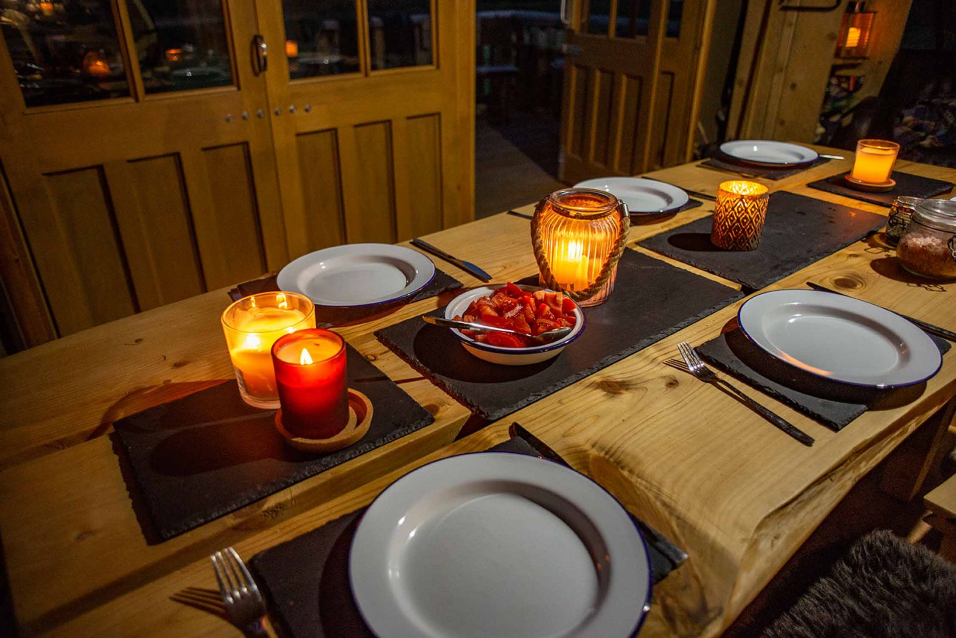 Our long handmade wooden table has sheepskin covered benches providing plenty of seating for those sociable feasts.