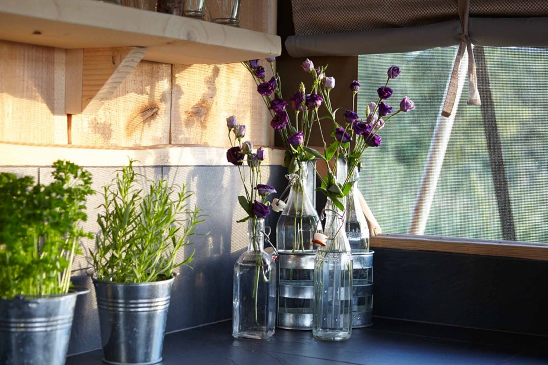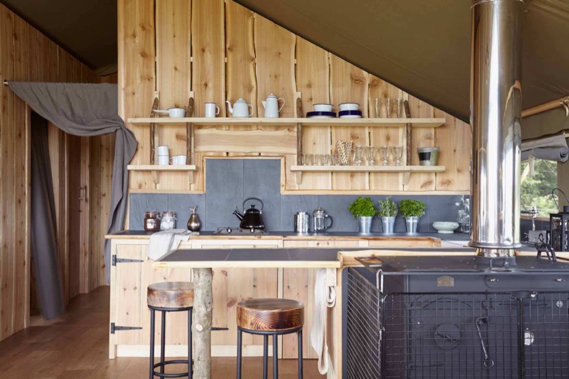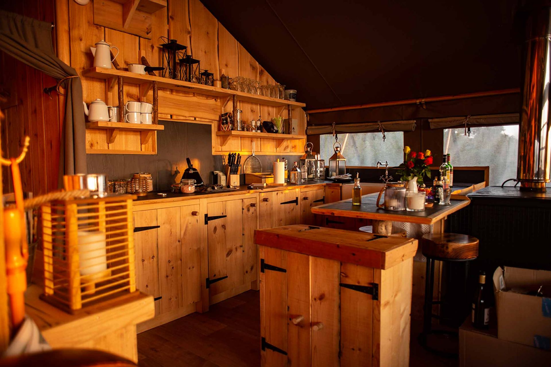 Our well-equipped kitchen is full of rustic charm. 85% of the wood used was sourced locally and the shelves & cupboards were created by local craftsman.