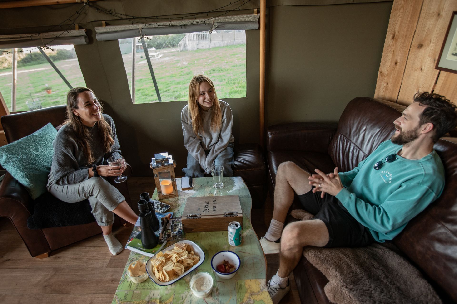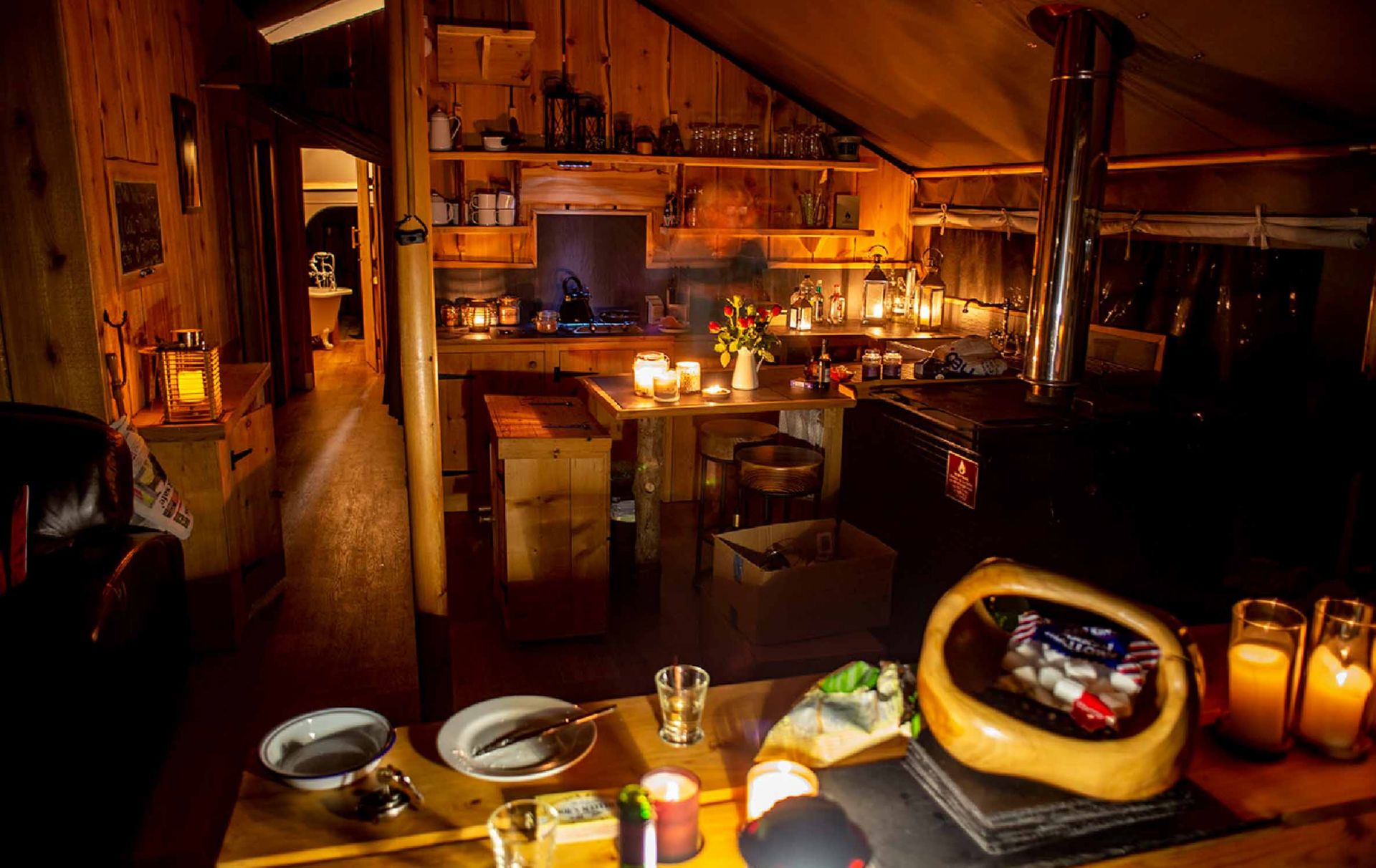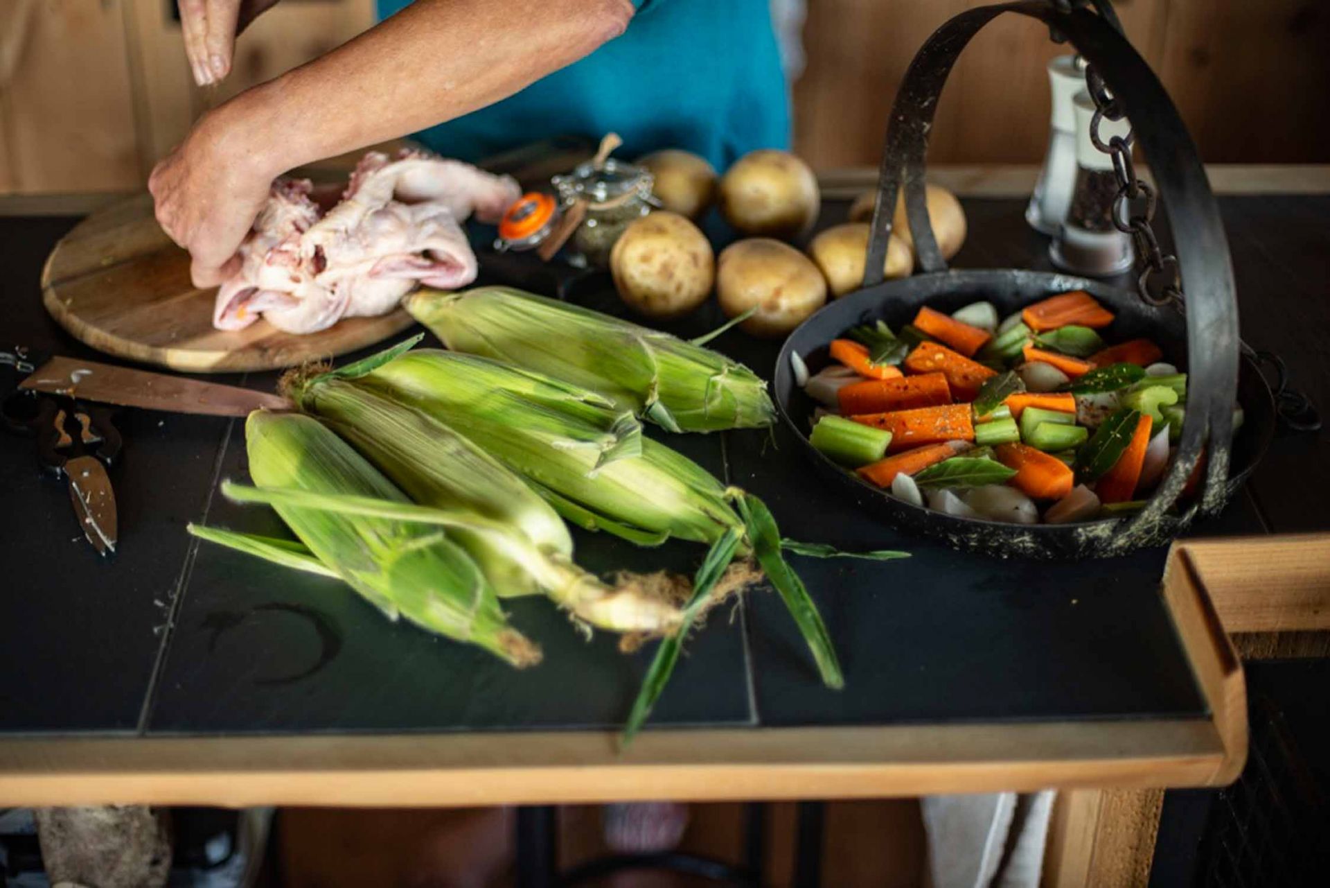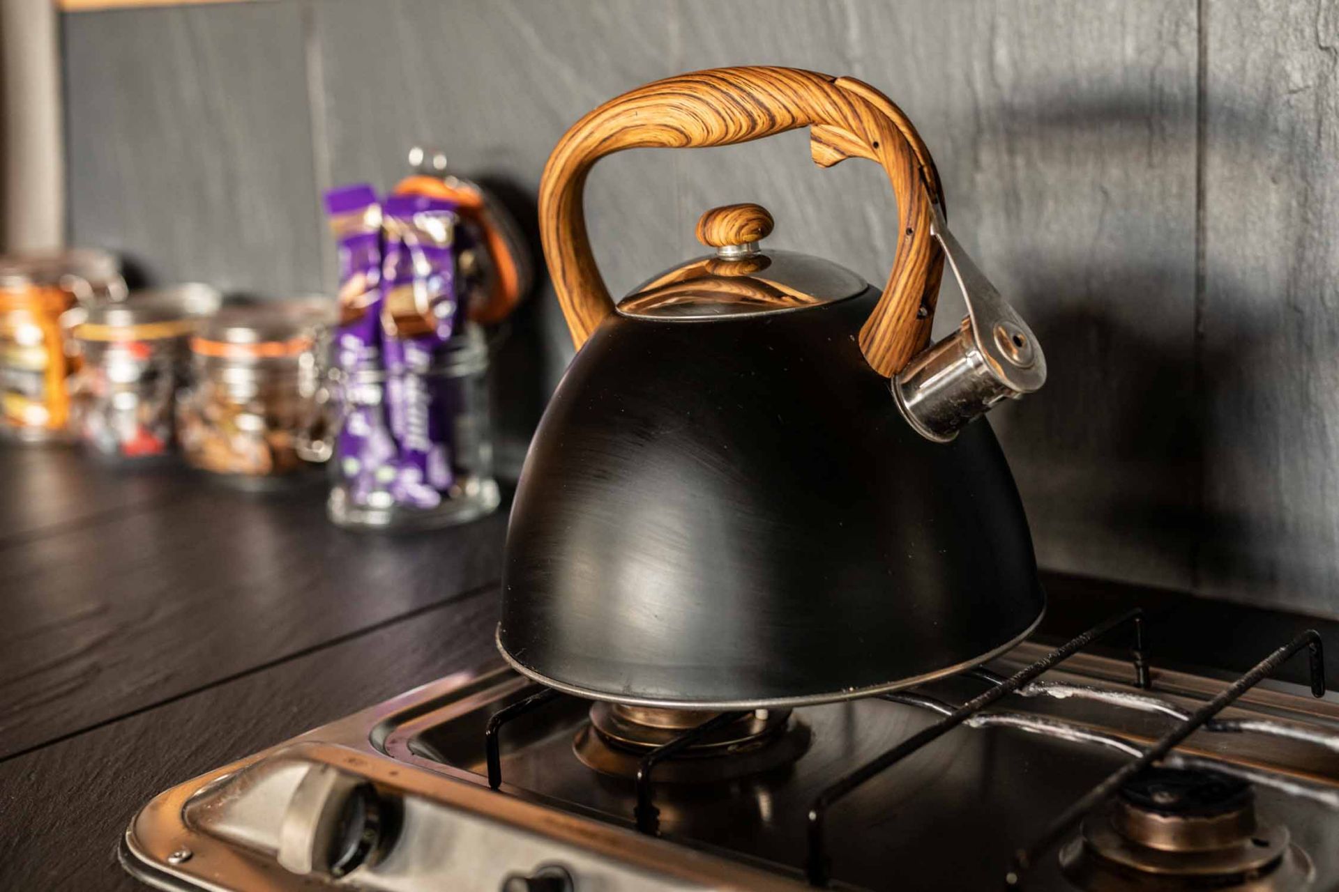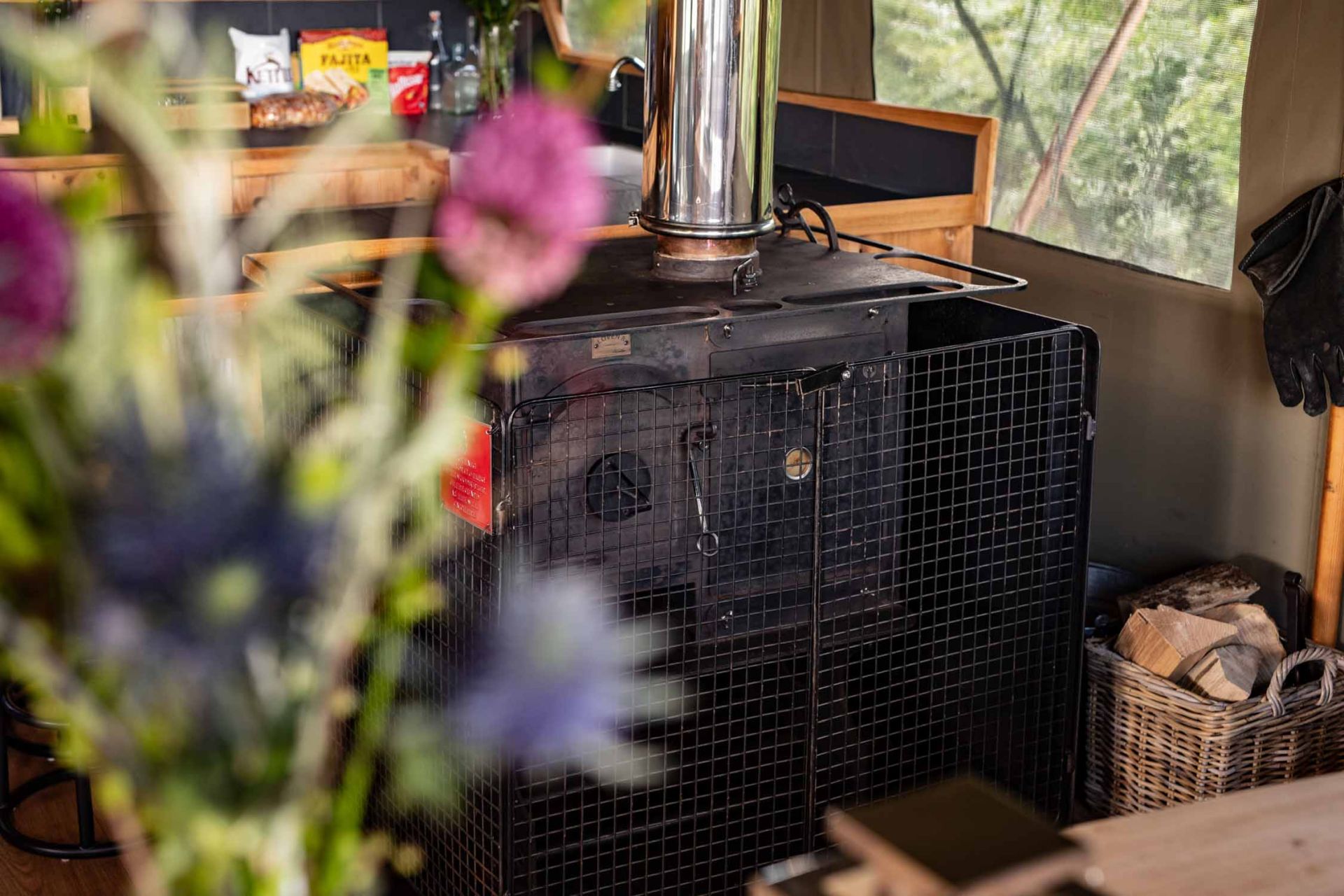 The large cast iron wood burner is the heart of the lodge providing your heating and cooking oven. It has a large hot plate doubling up as a hob with the oven section has a deep shelf for two oven trays. It is so satisfying to keep it stoked and feel the glow of the fire. It has a generous hearth and fireguard too.