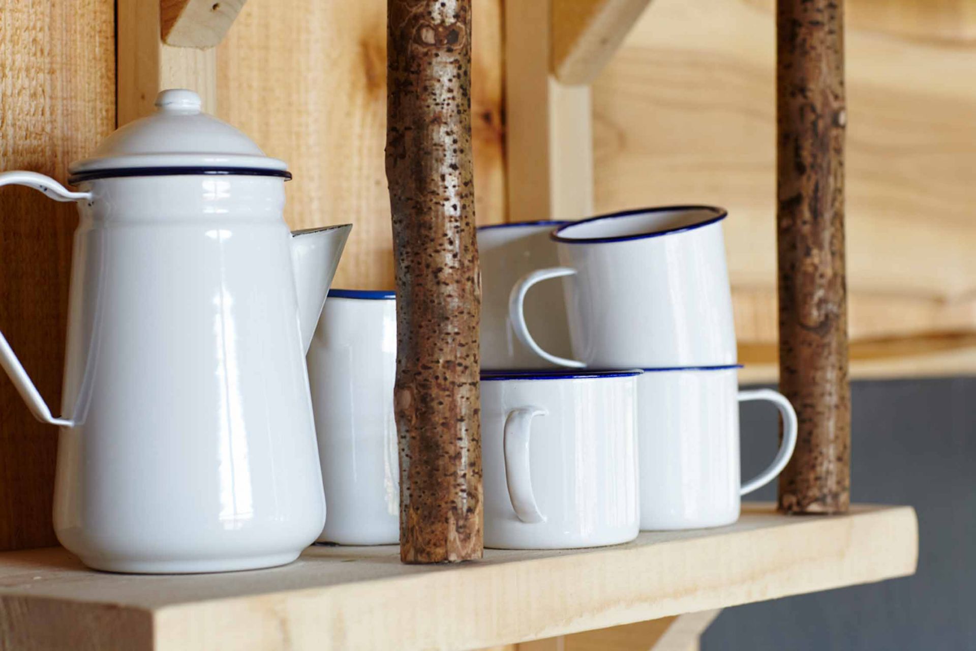 Each kitchen has a gas-fired hob, fridge (with small freezer section), butler sink, large cool box, enamel tableware, melamine tumblers and heavy glassware. There are pots, pans, utensils and cutlery.