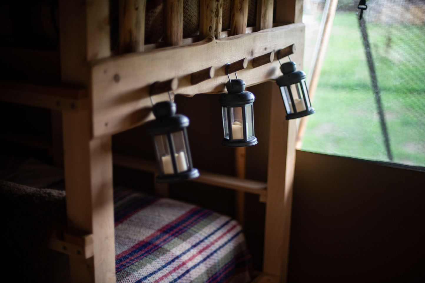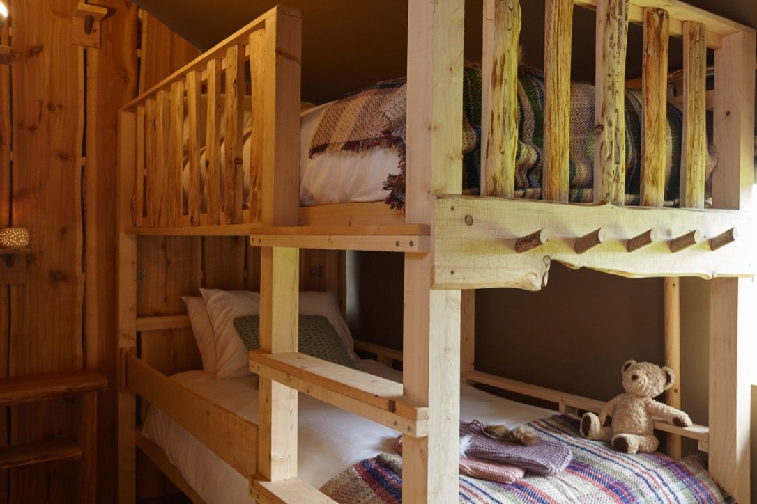 Your glamping holiday with us is all about comfort; super comfy beds, crisp cotton sheets, soft throws and hot water bottles. There are three bedrooms; one double with king-size bed, one twin and one bunk room.